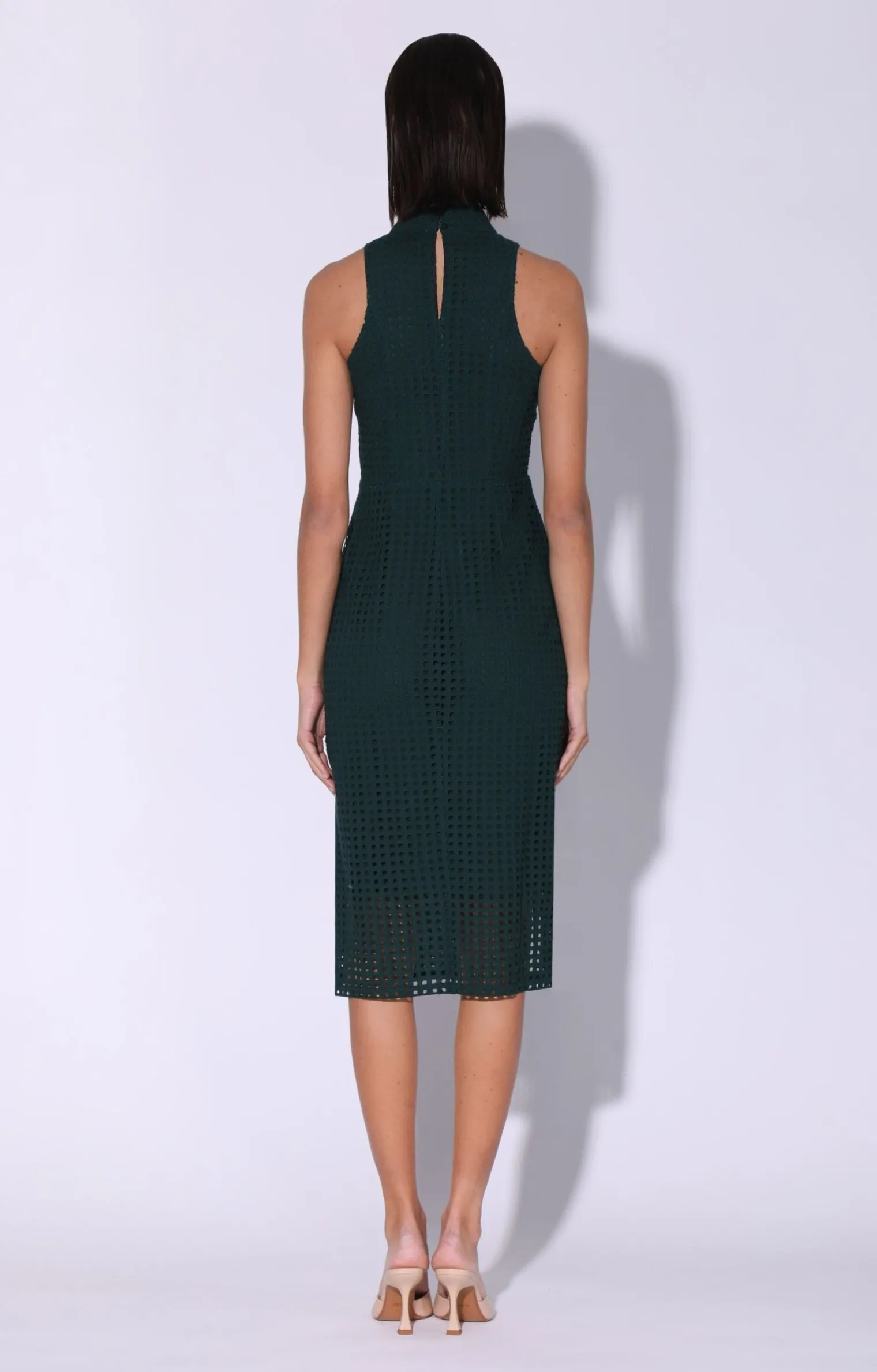 Buttons With Loops Closure At Back Of Neck Band, Over Back Keyhole; Hidden Side Seam Zipper; Sleeveless; Midi Length; Side Seam Slit On Lef Of Skirtt; Bodic Fully Lined, Skirt Partically Lined