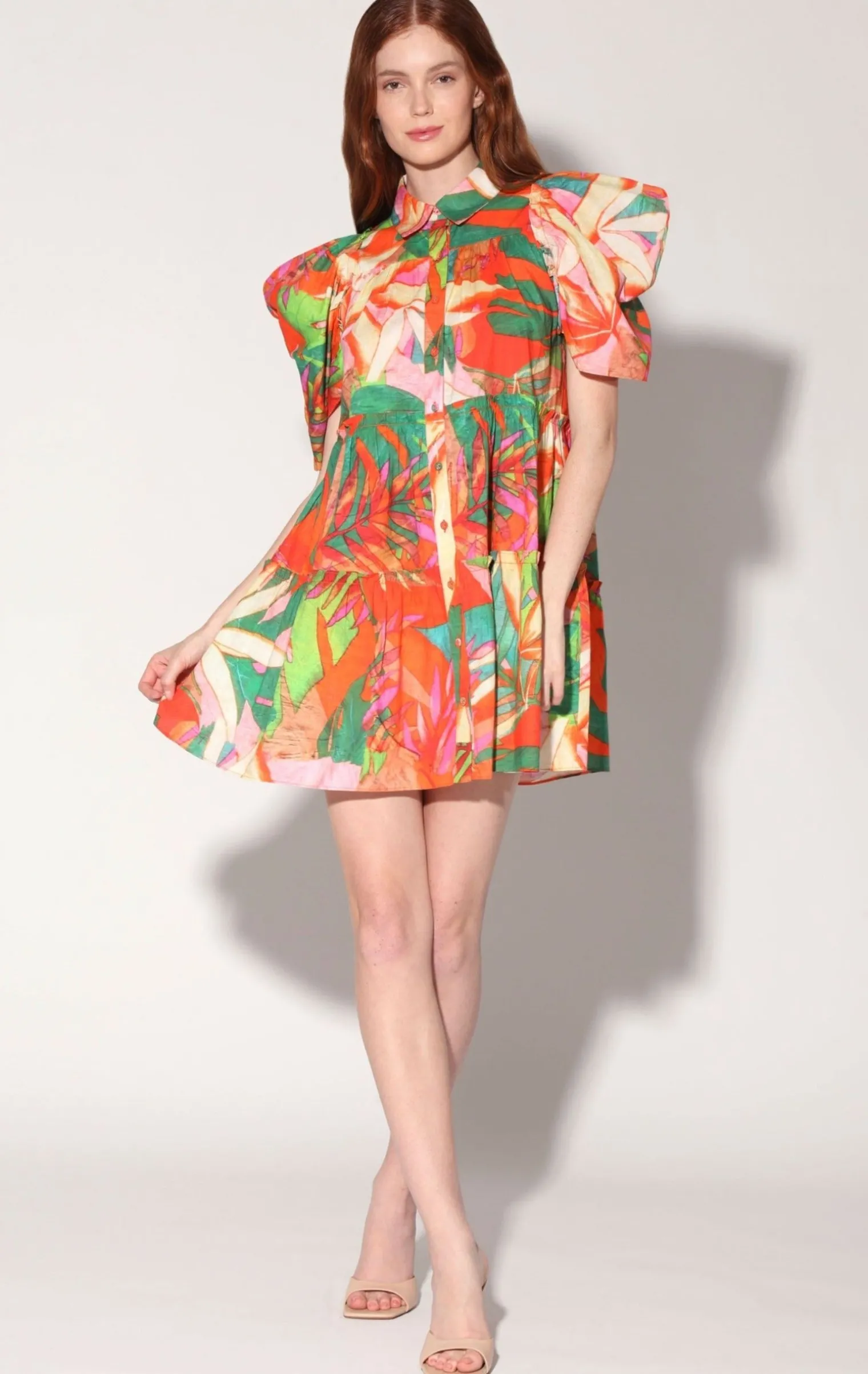 Get Ready To Turn Heads In The Loreene Dress! This Mini Shirt Dress Showcases Tier Detail, Shirred Statement Sleeve, And A Colorful Print