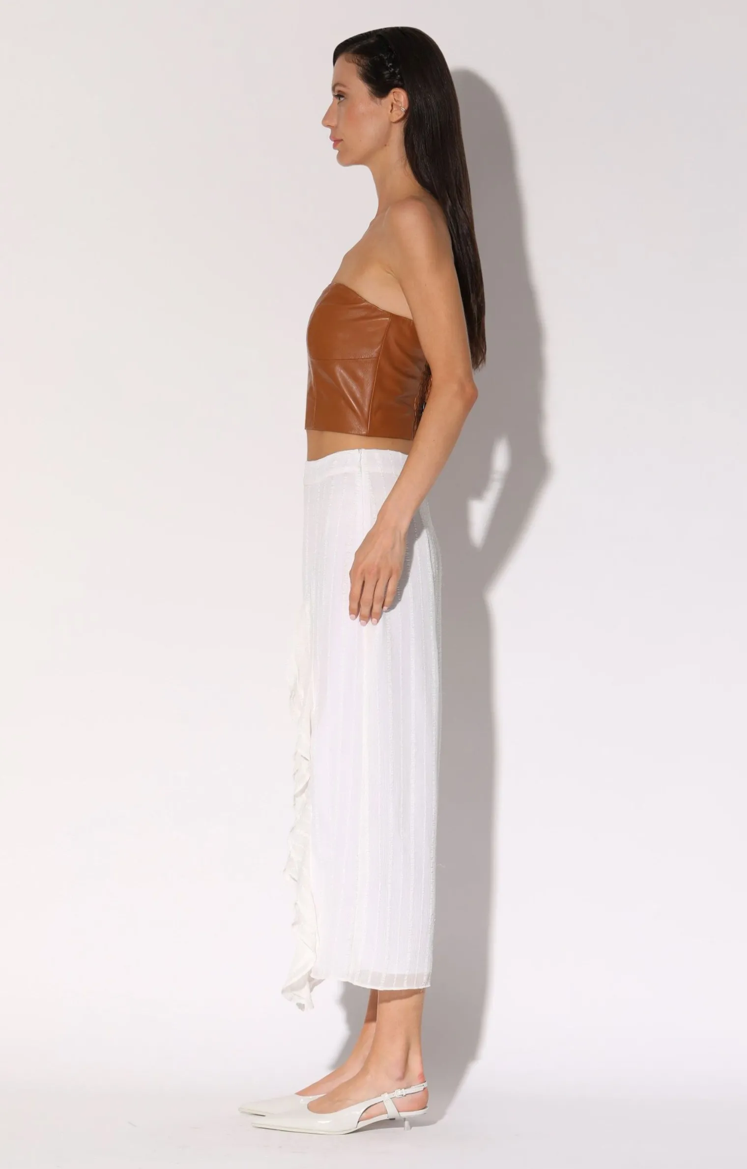 The Frida Skirt Is A Midi Skirt Elevated With Chic Cascade Ruffles On Its Front Side Slit